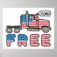 Der People's Freedom Convoy zeigt einen patriotischen LKW in den USA-Farben und hupt so, wie sie geht, mit dem Wort "FREE" unten in den US Flagge. Feiern Sie den Freiheitskonvoi und geben Sie eine Erklärung ab.