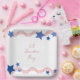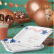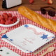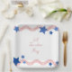 Feiern Sie Amerikas Geburtstag mit diesem lustigen und patriotischen 4. Juli Hinterhof Grillen Party Design mit festlichen roten Streifen und blauen Sternen auf einem Elfenbeinhintergrund.