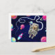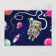 Der französische Bulldog mit einem Raumschiff und einem Helm zog sich an ein Raumschiff auf dem Weltraumspaziergang, das eine weit entfernte Galaxie erforschte. Niedliche Hund- und Katzenpostkarten speziell für Kinderzimmer und Kinderspielplatz.