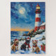 Bring charming, bat-eared cuteness to your holiday season with this adorable French Bulldog Christmas design! This magical scene features three cute, expressive French Bulldogs (Frenchies) sitting contentedly at the base of a tall red-and-white lighthouse, which stands majestically on a snowy coastal cliff. The lighthouse is beautifully adorned with glowing Christmas lights and fragrant garlands. The dogs wear festive Santa hats and cozy scarves, surrounded by colorful wrapped gifts and cheerful holly branches. The ocean waves sparkle in the moonlight while soft snowflakes drift gently in the air, creating a truly magical winter holiday atmosphere. This design is a perfect Christmas gift for any French Bulldog owner, dog lover, or admirer of festive and beloved companion dog art, capturing the serene joy of the season.