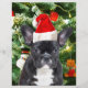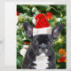 Niedlicher französischer Bulldogge mit Weihnachtsbaumschmuck Snow Man im Hintergrund.