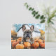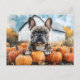 Ein Gemälde im Aquarellstil eines französischen Bulldoggen, der zwischen Kürbissen vor einer rustikalen weißen Scheune sitzt. Herbstbäume umrahmen die Szene mit warmen goldenen Tönen, die eine gemütliche saisonale Atmosphäre schaffen.