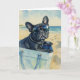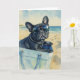 Diese Grußkarte enthält ein Aquarellportrait eines schwarzen französischen Bulldoggen, der in einer Totentasche am Strand sitzt.