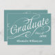 Blauer Hintergrund mit weißem Wirblen Skripttext mit "Graduate", und ein benutzerdefiniertes Jahr, großartig für den Graduierten, um die große Leistung anzukündigen. Feiern Sie auf der Rückseite mit einem benutzerdefinierten Empfang-Event-Text für Ihre Gäste. Alle Designs Copyright © www.CustomInvitesOnline.com