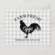 Silhouette in der Mitte mit "Eier"-Textüberlagerung auf kariertem Gingham-Hintergrund. Zusätzlicher Text: "Frisch, frei, Bio". Große Wohngestaltung für Bauernhof, Land und rustikale Themen.