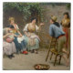 Dieses Design zeigt ein Gemälde des italienischen Künstlers Eugene de Blaas (1843-1931). Es zeigt eine Gruppe von Frauen, die an einer Näharbeit im Garten arbeiten; sie unterhalten sich mit einem Jungen, der sich auf der Rückseite eines Holzstuhls lehnt. Auch auf dem Boden gibt es Früchte in einer Schüssel aus Korbgeflecht, vielleicht Äpfel. Die Frauen sehen glücklich und animiert aus, während der Junge sie mit seinem Chat unterhält. Es gibt auch eine andere Frau stehend neben einer nahegelegenen Ziegelmauer mit ihren Armen akimbo. Im Hintergrund sieht man eine Pergola mit Efeu, die darüber wächst. Der Boden ist staubig, aber die Frauen tragen elegante Kleider, und der Junge trägt ein blaues Shirt und einen traditionellen Hut, mit einer Bandana oder einem Schal um den Hals gewickelt. Die ursprüngliche Kunst wurde 1905 gemalt.