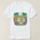 Im T - Shirt-Design steht der Begriff "Freundschafts-Oase" in fett- und farbenfrohen Buchstaben. Es ist von tropischen Elementen wie Palmen, Blume und einer sandigen Wüstenlandschaft umgeben. Der Gesamteindruck besteht aus Wärme, Freundlichkeit und einer entspannenden und einladenden Atmosphäre.