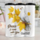 Diese ruhige Grafik zeigt eine weiße Taube, die auf einem Zweig mit großen gelben Blätter ruht. Das Design umfasst das biblische Zitat "Peace I Verlass with You" und "John 14:27", das ein ruhiges und inspirierendes Stück kreiert.