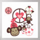Friedenszeichen in Rosa und Schokoladenbraun, Herz und kleine Affen, eine mit rosa Kappe auf den T - Shirt des Friedensstifters, Magneten, Karten, Aufkleber, Mousepads, Taschen, Knöpfe, Halsbecher, Kissen, Wanduhren und vieles mehr!