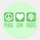 Friedenszeichen, Herz und Baum auf grünem Hintergrund und Frieden, Liebe, Roots-Text darunter.