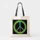 Diese Totentasche ist mit dem runden Muster des internationalen Friedenssymbols versehen. Die Farben Blau, Grün und Gelb auf einem schwarzen Hintergrund ergeben ein dramatisch geometrisch abstraktes Muster.