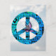 Ein Friedensschild schwimmt vor einem Hintergrund des blauen Himmels und blühenden weißen Wolken. Das Friedenszeichen ist mit Blues und hellen Grüntönen gestaltet. Worte innerhalb des Friedenszeichens erinnern uns daran, Toleranz, Optimismus, Liebe, Empathie, Respekt, Hoffnung, Güte und Harmonie zu üben. In der Mitte des Friedenssymbols befindet sich eine Taube im schwarzen Ausschnitt, die in lila- und rosa Farbtönen hervorgehoben ist. Auf der Rückseite der Postkarte steht: Ein Jubiläum und eine weitere Chance für uns, es richtig zu machen. Alles Gute 2021!