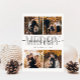 Elegante und moderne Urlaubskarte mit Typografie, die "friedlich, spielerisch, fröhlich" mit 4 quadratischen Bildern sagt. Fügen Sie der Nachricht ein weiteres Foto auf der Rückseite hinzu. Der Hintergrund ist weiß.