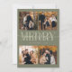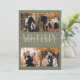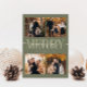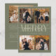 Elegante und moderne Urlaubskarte mit Typografie, die "friedlich, spielerisch, fröhlich" mit 4 quadratischen Bildern sagt. Fügen Sie der Nachricht ein weiteres Foto auf der Rückseite hinzu. Hintergrund ist sage grün.