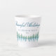 Friedlicher Winterwald Wasserfarben Weihnachtsfeiertage Tasse. Wasserfarbe zeichnend von einem Wald im Winter und Schnee, Winterbäume mit Schnee in blau und grün. Das Design ist friedlich und ruhig mit Text in elegantem Skript. Passen Sie Ihren Namen und das Jahr an und machen Sie ein schönes Weihnachtsgeschenk und einen Sake für Ihre Familie und Freunde.