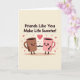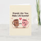 This greeting card shows two cute mugs in the center, holding hands like close friends. One mug is a deep mocha brown and the other is a soft pink, and both have round black eyes, rosy cheeks, and big happy smiles. Their little arms are thin and black, reaching toward each other to show warmth and connection. The background is a light creamy pastel, with small pink hearts and tiny star shapes floating around them for a sweet, loving feel ❤️. At the top, the card says “Friends Like You Make Life Sweeter!” in dark brown block letters that stand out clearly. Gentle shading and small shadows under the mugs give the picture a bit of depth without making it busy 💌🍫.