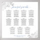 Dieses 11 Tisch Sitzdiagramm ist schlicht und elegant mit dunkelgrauem und hellblauem Text auf weißem Hintergrund. Das Design ist mit einem kalligraphischen Titel mit zartem Schriftzeichen versehen, der in den Ecken dekorative, kühle Imitate silberne Filigree enthält. Stilvoll, elegant und raffiniert, um Ihren Gästen zu helfen, ihren Platz an Ihrem Hochzeitsempfang zu finden. Es beinhaltet Tischbelegung für 110 Gäste mit 10 Plätzen pro Tisch.