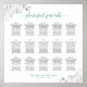 Diese Hochzeitskarte beinhaltet Tischbelegungen für 150 Gäste an 15 Tischen. Das Design ist schlicht, aber elegant, mit dunkelgrauem, aquamarinem oder türkisfarbenem Text auf weißem Hintergrund. Der Titel ist in laky Skriptkalligraphie geschrieben und es gibt silberne Imitate Folie frilly Blumendekorationen in den Ecken. Stilvoll, elegant und raffiniert, um Ihren Gästen zu helfen, ihren Platz am Empfang zu finden.