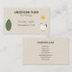 Eine Visitenkarte für Frische Eier auf beigem Hintergrund mit grünem Blatt, gelber Sonne und weißem Huhn. Es könnte für einen Familienbetrieb, Lebensmittelmärkte, Lebensmittelgeschäfte usw. verwendet werden.