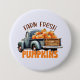 Genießen Sie den Charme der Herbsterntezeit mit diesem rustikalen Bauernhof Fresh Pumpkins Knopf, mit einem Vintagen LKW, der mit Kürbissen überflutet. Ideal für diejenigen, die Liebe fallen Festivals, Kürbispflaster und Land leben.