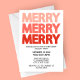 Mit dieser aufschlussreichen Party Einladung erfreuen Sie sich an der Ansammlung Ihres Urlaubs! Das Design enthält das Wort "MERRY" dreimal in fett gedruckter, allkapseliger Schrift, die von einem weichen, rot-rosa oben zu einem tiefgefärbten Rot am unteren Ende wechselt und einen lustigen Obré-Effekt erzeugt. Das Set vor weißem Hintergrund, der minimalistische und dennoch auffällige Stil macht Ihre Veranstaltungsdetails einfach zu lesen und die Einladung zeitgenössisch und festlich. Ideal für Weihnachtsfeiern, Feierlichkeiten im Büro oder für Ansammlungen mit der ganzen Familie. Diese Karte lasse Ihnen, Ihr eigenes Datum, Ihre Uhrzeit, Ihren Ort und Ihre UAWG zu bestimmen. Eine einfache, stilvolle Art, den Urlaub fröhlich zu verteilen!