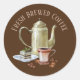 frisch gebrühter Kaffee mit klassischem Rundaufkleber