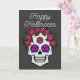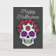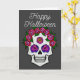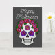 Eine Grußkarte mit einem handgemalten Schädel mit regenbogenfarbenen Rose auf dunkelgrau mit den Worten Happy Halloween vorne. Im Inneren steht: "Mögen all Ihre sprichwörtlichen Wünsche wahr werden."