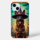 Der fröhliche deutsche Schäferhund trägt einen skurrilen lila Hexenhut. Der Hund sitzt mit einem spielerischen Ausdruck und seiner Zunge im Vordergrund. Um den Hund sind geschnitzte Kürbisse, die eine saisonale Touch, während eine spooky Hintergrund umfasst Silhouetten von Fledermäusen, die gegen einen Gradientenhimmel fliegen. Die Szene ist gerahmt mit einer lebhaften orangefarbenen Grenze und Touchs von Halloween-Themen, wie Spinnennetze, die ein festliches und spielerisches Ambiente schaffen.