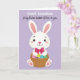 Diese Karte zeigt ein süßes, menschenähnliches Kaninchen, das in der Mitte des Rahmens zentriert ist und mit einem sanften, freundlichen Blick nach vorne schaut 🐰. Das Kaninchen ist strahlend weiß mit weichem Rosa im Inneren der hohen Ohren, einem rosigen Teint auf den Wangen und Rosa auf den Pfoten, was ihm eine zarte, liebevolle Präsenz verleiht. Um seinen Hals sitzt eine übergroße, tiefrosa Schleife, wie ein süßer, geschenkbereiter Touch, der auf Nähe und Fürsorge hindeutet. Das Kaninchen hält einen rustikalen, geflochtenen Korb eng an seinen Körper, als ob es ihn jemand Besonderem auf eine warme, vertraute Weise anbieten würde. Im Korb befinden sich dekorierte Ostereier in kräftigen Farben wie Blau, Gelbgrün und Lila, mit einigen gepunkteten Mustern, die zusätzlichen Charme verleihen 🌷. Der Hintergrund ist ein glattes Lavendelfeld, das den Fokus auf das Kaninchen und den Korb hält, während es sich dennoch weich und frühlingshaft anfühlt