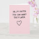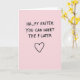 Diese Karte sitzt auf einem weichen rosafarbenen Hintergrund, der sich sanft und einladend anfühlt, mit einer flirtenden Note 🌷. Zentriert nahe der oberen Kante liest man in dicken, handgeschriebenen schwarzen Buchstaben „HA_PY EASTER“, wobei eine deutliche Lücke bleibt, wo ein Buchstabe sein sollte. Direkt darunter wird der gleiche schwarze Text mit „YOU CAN INSERT THE P LATER“ fortgesetzt, wodurch der fehlende Buchstabe zu einem frechen kleinen Schubs zwischen engen Freunden oder einem Paar wird 🐰. Die Buchstaben sehen leicht ungleichmäßig und lässig aus, wie eine schnelle Notiz, die mit einem Marker hingeworfen wurde, was den Witz noch intimer macht. Der kräftige schwarze Text sticht scharf vom hellrosa Hintergrund ab und hält die Aufmerksamkeit auf die Nachricht und der leeren Stelle. Weiter unten auf der Karte sitzt ein einfacher schwarzer Herzumriss zentriert, der den entspannten Linienstil der Wörter widers