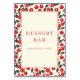 Dieses Hochzeitstisch-Schild verfügt über ein charmantes Design mit einer zentralen cremefarbenen Umrandung, umgeben von einem spielerischen Muster aus roten Kirschen und dunkelgrünen Blättern auf weißem Hintergrund. Die fetten Serifenschriftzüge in tiefem Rot verkünden "DESSERT BAR" mit einer einladenden Botschaft darunter, die die Gäste zum Zugreifen animiert. Die klassische und fröhliche Ästhetik schafft eine willkommene Atmosphäre, die perfekt für Feiern ist und es zu einer idealen Ergänzung für jeden Dessert-Buffet-Aufbau macht.