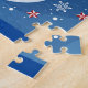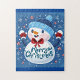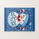 Illustration eines Puzzles mit einem Schneemann, der einen blauen Hut und eine rote Krawatte trägt, umgeben von Schneeflocken und Sternen auf blauem Hintergrund, mit den Worten "Frohe Weihnachten" in kursiver Schrift. Der Stil ist kartoonisch und festlich, geeignet für ein urlaubsortes Produkt.