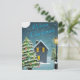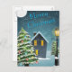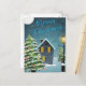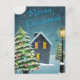 Weihnachtsgrüße mit Bäumen, Schnee, Haus und Straßenlaterne
