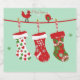 : Eine festliche Weinflasche mit einem Urlaubslabel mit farbenfrohen Weihnachtsweihnachtsbäumen, die an einem Wäscheständer hängen. Jeder Strumpf hat ein einzigartiges Farbmuster in Rot, Grün und Weiß, das eine fröhliche Touch verleiht. Ein kleiner Vogel steht auf der Schlange und sorgt für ein gemütliches Urlaubsatmotiv. Der Hintergrund ist leicht und sanft, die Strümpfe sind sehr lebendig und eignen sich hervorragend zum Schenken während der Ferienzeit.