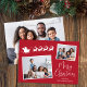 Feierliche rote Urlaubskarte mit 2 verstreuten Fotos in weißen Rahmen, einer weißen Silhouette von Rentieren, die den Schlitten des Weihnachtsmannes fliegen, "Frohe Weihnachten" in einem stilvollen weißen Drehbuch und Ihrem Namen in schlichter, moderner Weißtypografie. Fügen Sie auf der Rückseite ein zusätzliches Foto hinzu.