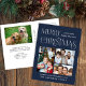Elegante blaue Urlaubspostkarte mit "Fröhlicher Weihnachten" in Vintager Typografie, "Happy New Year" und einem Gruß in moderner Weißtypografie, drei Ihrer Lieblings-Fotos und Ihrem Namen. Auf der Rückseite, fügen Sie ein 4. Foto und personalisieren Sie Ihre saisonale Botschaft an Familie und Freunde.