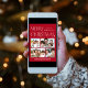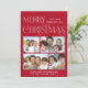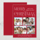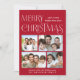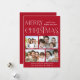 Elegante rote Feiertagskollektionskarte mit "Frohe Weihnachten" in Vintager Schrift geschrieben, "Happy New Year" und einem saisonalen Gruß in moderner Weißtypografie, 4 Ihrer Lieblings-Fotos und Ihren Namen.