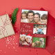 Einfache rote Foto Collage Urlaubskarte. "Frohe Weihnachten" ist in einem stilvollen weißen Drehbuch geschrieben und Sie können mit 4 Fotos und Ihrem Familiennamen und dem Jahr in der modernen weißen Typografie personalisieren.