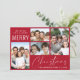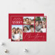 Moderne rote Urlaubskarte mit einer 4-Foto-Collage, "We want you A Very Merry Christmas" in schlichter weißer Typografie und einer eleganten weißen Schrift, und Ihren Namen und das Jahr.