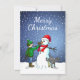 Frohe Weihnachten vom Schneemann, Junge und Hund auf einer Weihnachtskarte.