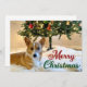 Ein wunderschöner Pembroke Welsh Corgi Hund unter dem Weihnachtsbaum macht eine niedliche Hundeschlittenfotografie mit frohen Weihnachten geschrieben in festlich rot und grün kursiv Skript darunter. Eine hübsche Haustier-Besitzerkarte für Ihre Freunde und Familie, die Hunde Liebe.