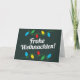 Weihnachtskarte auf Deutsch. Auf der Karte steht "Frohe Weihnachten" um frohe Weihnachten zu wünschen. Es hat Weihnachtsbeleuchtung und eine Schrift mit kühnen Schriftart, die sich in einem Raum auszeichnen.