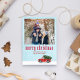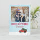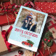 Ein Vintager weißer LKW-Winterszene, der aus dem Wald oder dem Weihnachtsbaum zurückkehrt, mit dem Weihnachtsbaum in diesem Jahr. Mit einem fröhlichen Weihnachtsfest, einer Fotovorlage, mit einer niedlichen Wasserfarbe, niedlichem Retro-Winter, Vintagem rotem LKW, einem minimalistischen, minimalen Schneefall, mit einem Weihnachtsbaum, mit blau und rot, Urlaubsfotokarte