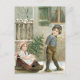 Weihnachtskarten-Illustration von Viktorianischen Kindern mit einem kleinen Weihnachtsbaum auf einem Schlitten.