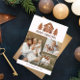 Weihnachtsfotokarte mit einem Lebkuchenhaus mit zwei Pfefferkuchenbäumen, die mit weißem Zuckerguss geschmückt sind. Fügen Sie drei Fotos Ihrer Familie hinzu!