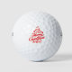 Ein weißer Golfball mit einem roten "Frohen Weihnachten"-Design. Der Golfball ist Set vor einem schlichten, weißen Hintergrund. Das Design "Frohe Weihnachten" ist in einem dekorativen, kursiven Schriftart mit Schnörkeln und Verzierungen. Das Design umfasst kleine Bilder von einem Weihnachtsbaum, Schneeflocken und Ziergegenständen. Der Golfball hat eine abgeflachte Oberfläche, die typisch für Golfbälle ist. Die Beleuchtung ist weich und gerade, was die Struktur des Golfballs und die Details des Designs unterstreicht.