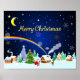 Schöne Schneeflocken mit Weihnachtsbäumen, Häusern, einem Schneemann und einem Regenbogen über dem Schnee, der vom Himmel fällt. Weihnachtsmann und ein Rentier, der zusammen spaziert, um Weihnachtsgeschenke an der Weihnachtsnachtsnacht zu verteilen.