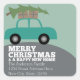 Ein moderner Holiday Gruß mit einer Illustration von einem Auto bewegenden Geschenke und einem Baum.