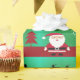 Frohe Weihnachten! Auf dem Design steht der Weihnachtsmann, sein Schlitten und sein Rentier fliegen über den Himmel. In der Mitte des Designs sind die Worte "Frohe Weihnachten" in Weiß. Am unteren Ende des Designs sieht Santa direkt auf Sie mit roten Bäumen und einem Schneemann. Die Hintergrundfarbe ist grün, und die kleinen Schneeflocken fallen.