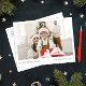 Eine stilvolle Foto-Postkarte mit klassischer Typografie "Happy Holidays" in Schwarz auf einem schlichten, minimalistisch-weißen Hintergrund mit weißem Rand. Foto, Name und Gruß lassen sich einfach für eine persönliche Touch anpassen. Ein einfaches, minimalistisches und zeitgenössisches Weihnachtsdesign, das sich in dieser Urlaubssaison auszeichnet! Das abgebildete Bild dient nur zur Veranschaulichung, um durch Ihr eigenes Foto ersetzt zu werden. Das Platzhalterbild ist ein Familienportrait. Sie tragen alle Weihnachtsmannmützen. Sie stehen vor einem Weihnachtsbaum.